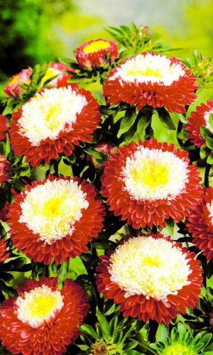 Привлекательная астра с плотными соцветиями, помпонного типа. Растения компактные, ветвистые, высотой до 50 см. Соцветия плоскоокруглые, диаметром 5-6 см, тёмно-красные, с белым центром. На растении до 30 соцветий. Используется для посадки в сборные цветники, на рабатки и на срезку.