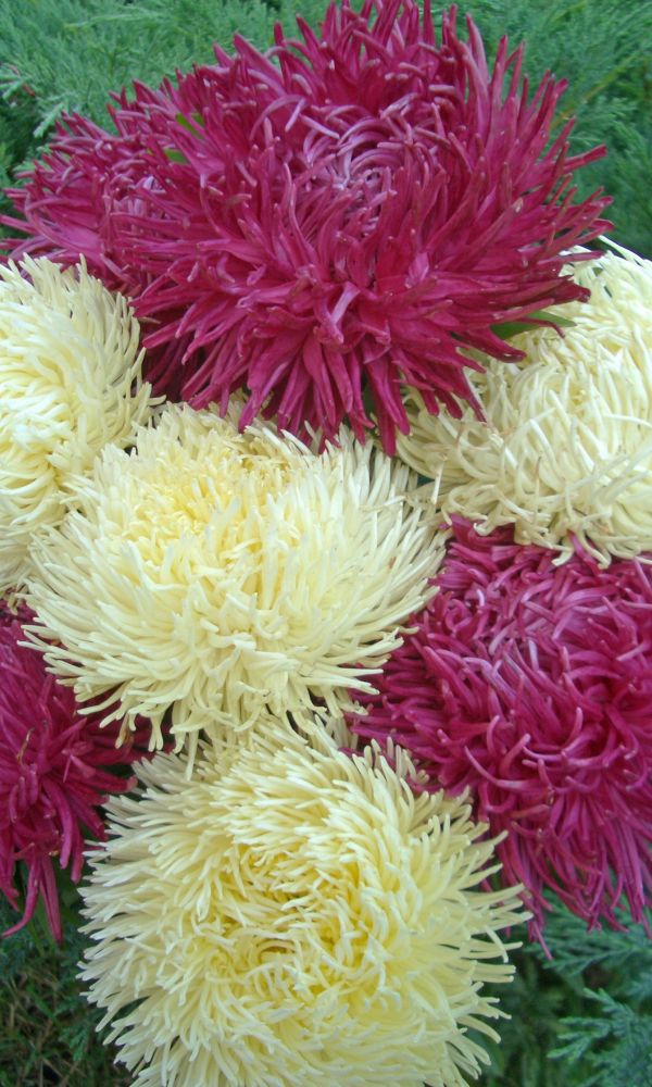 Густомахровая игольчатая астра! Растения высотой около 60 см. Соцветия густые длинноиголчатые, белые, кремово-жёлтые, серебристо - голубые, фиолетовые, серебристо - розовые, красные. Цветет в августе - сентябре. Используют очень широко: для посадки в сборные цветники...