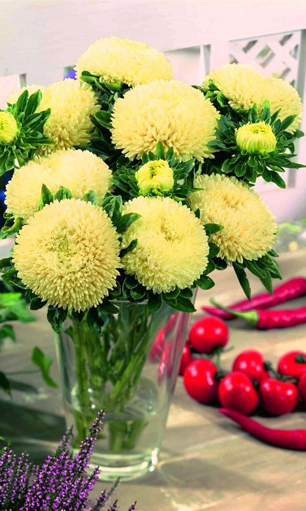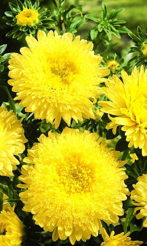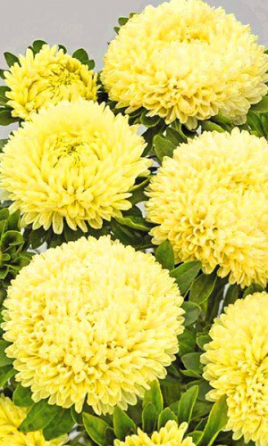 Очаровательные астры серии «Балун» превосходят по плотности и махровости соцветий. Изящное растение высотой 50-60 см с густомахровыми соцветиями, устойчивыми к проникновению дождя. Соцветия плотные, шаровидные, нежно жёлтого цвета, диаметром 9-13 см, по 6-8 штук на растении...
