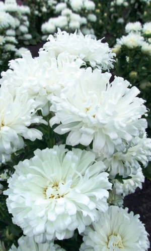 Великолепные цветы для букета. Растение высотой до 75 см, пирамидальной формы. Соцветия округло-плоские, махровые, диаметром 7-10 см. Язычковые цветки сложены по длине в трубки, слегка загнуты внутрь, окраска белая. Используют очень широко: для посадки в сборные цветники группами, на рабатки – рядами, на срезку...