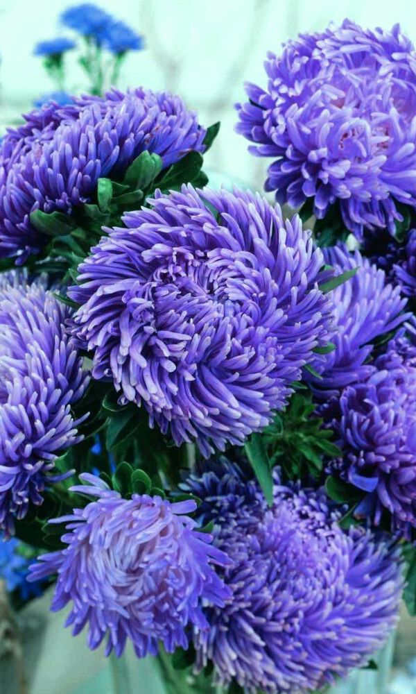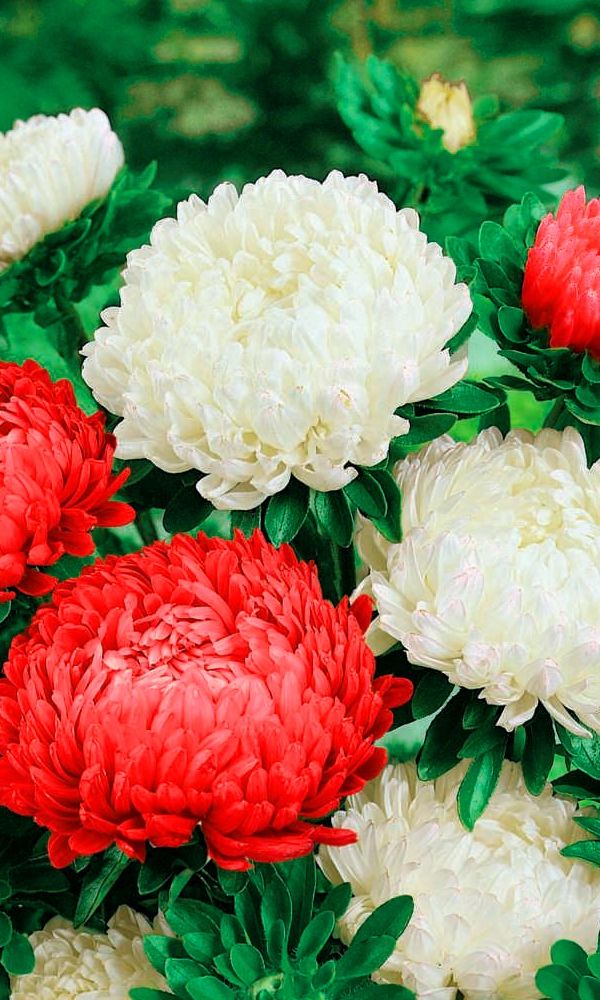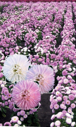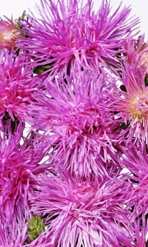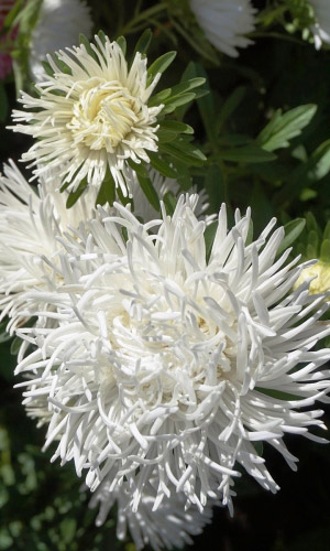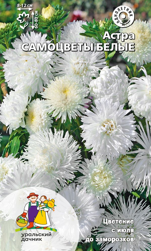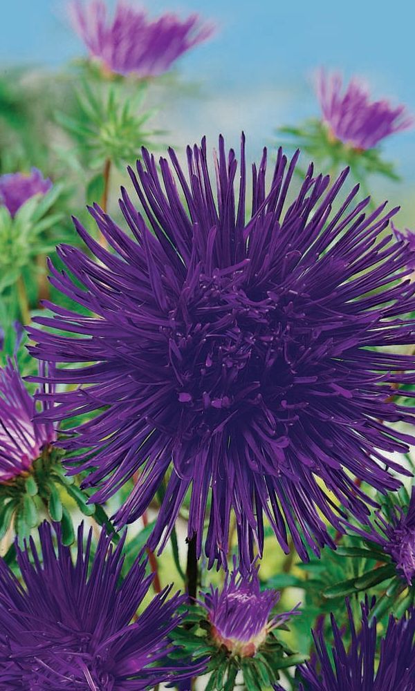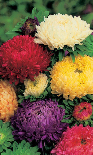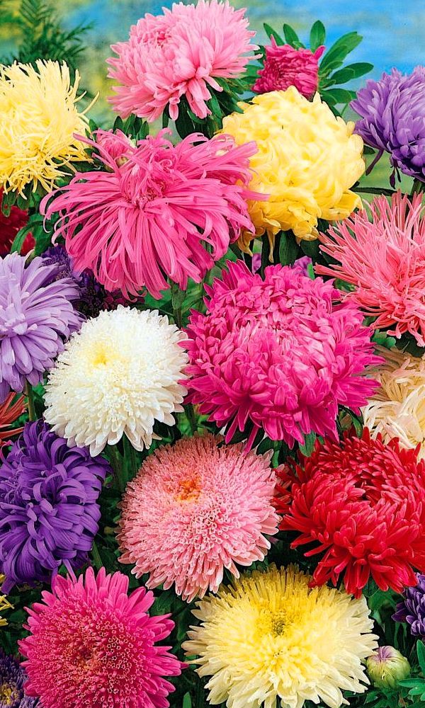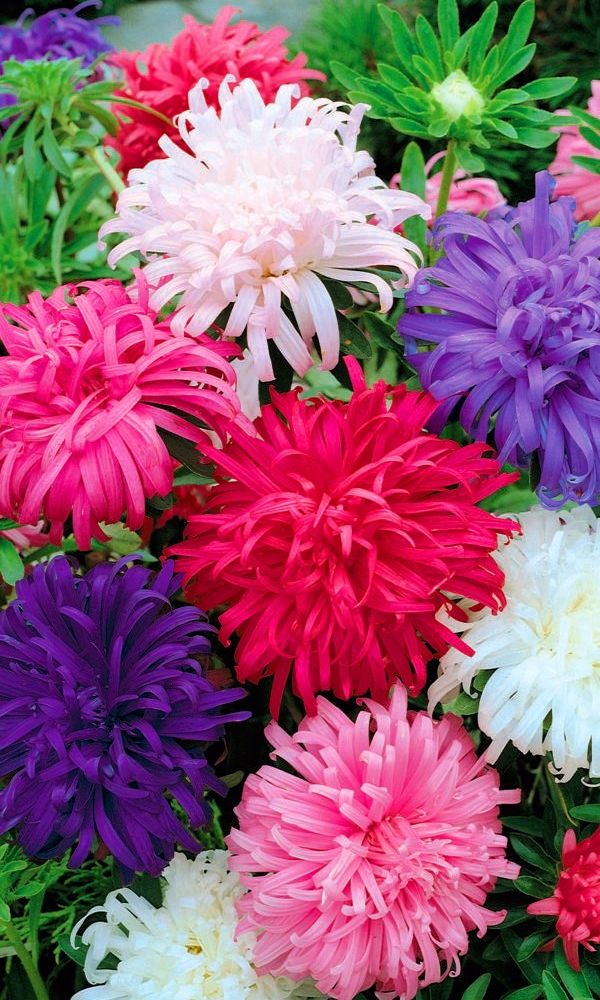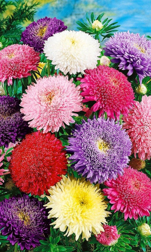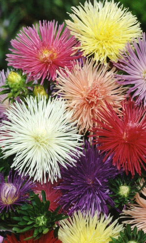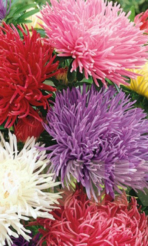 Густомахровая игольчатая астра! Растения высотой около 60 см. Соцветия густые длинноиголчатые, белые, кремово-жёлтые, серебристо-голубые, фиолетовые, серебристо-розовые, красные. Цветёт в августе - сентябре. Используют очень широко: для посадки в сборные цветники...