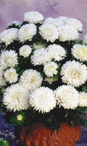 Новый сорт отечественной селекции. Растения компактные, высотой 40-45 см, пирамидальной формы. Соцветия небольшие, диаметром 5-6 см, густомахровые, белые. Одновременно на одном растении цветут до 25-30 соцветий, превращая кустик в пушистый снежно-белый ком. Сорт очень хорош в...