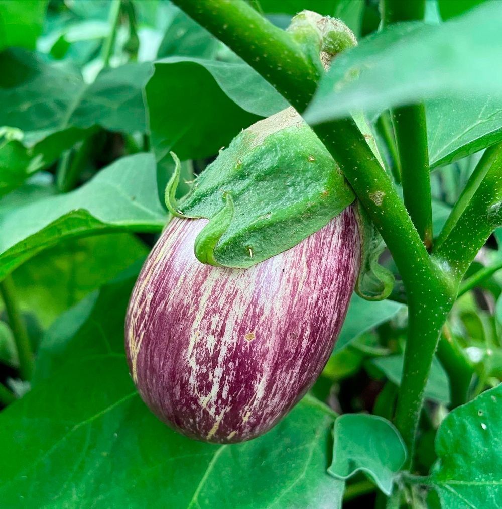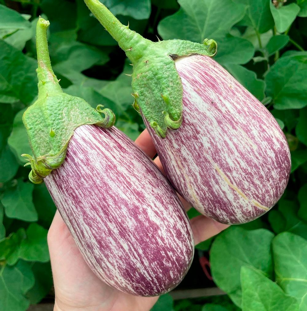 Среднеспелый сорт для открытого грунта и плёночных укрытий. Растение полураскидистое, высотой 63-75 см. Плоды овально-грушевидной формы, полосатые, с чередованием белых и ярко-выраженных розово-фиолетово-сиреневых полос, массой 250-400 г. Мякоть белоснежная, без горечи.