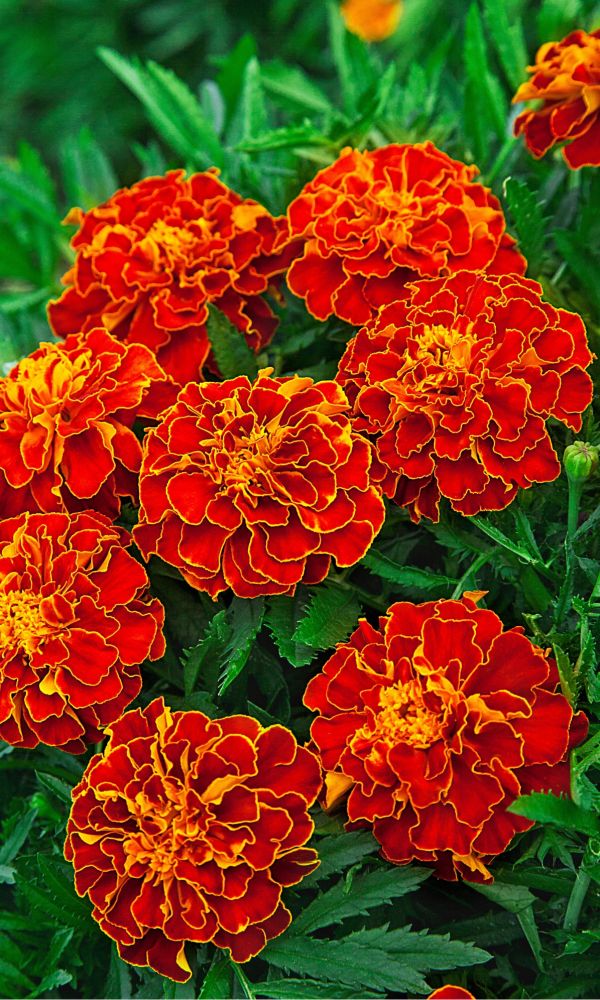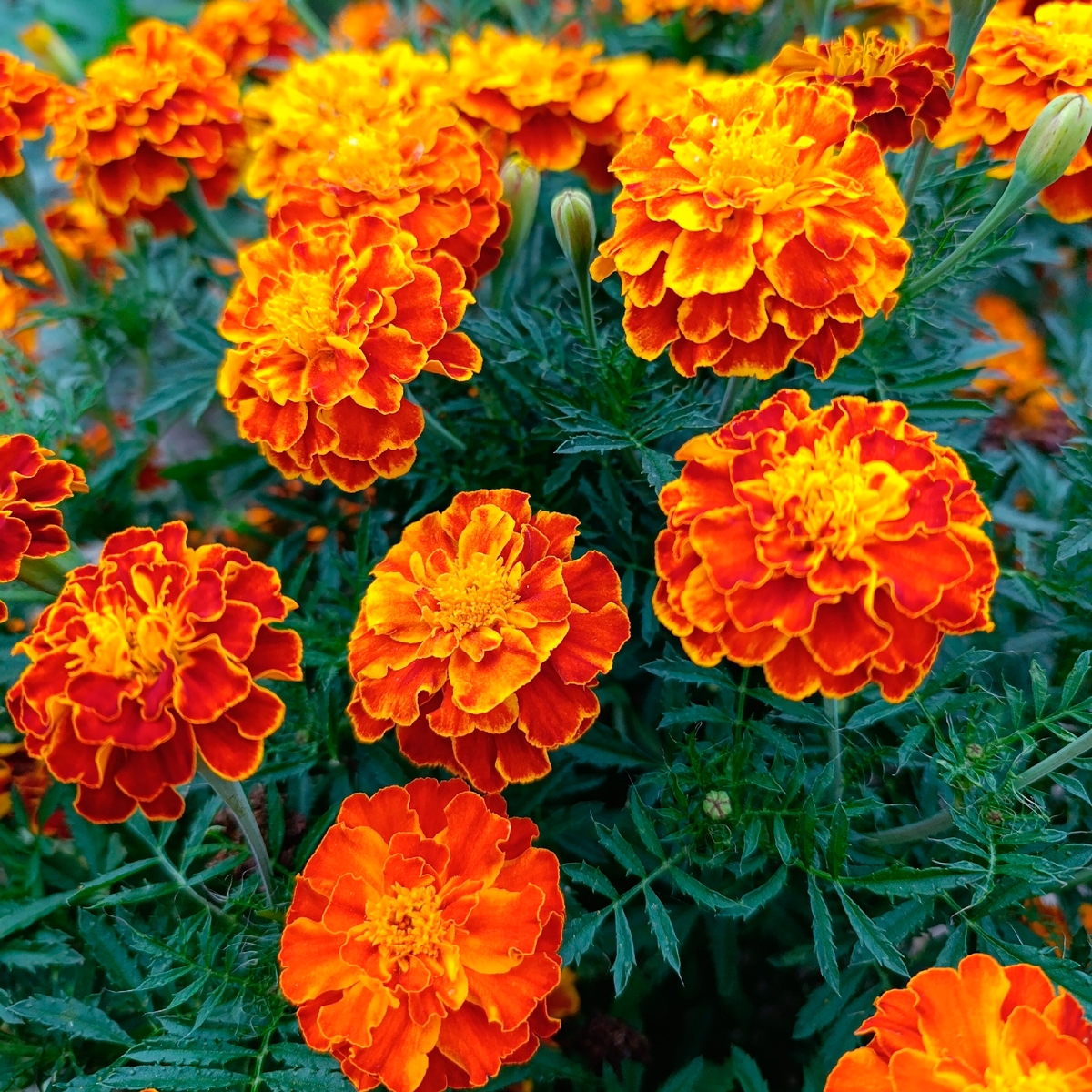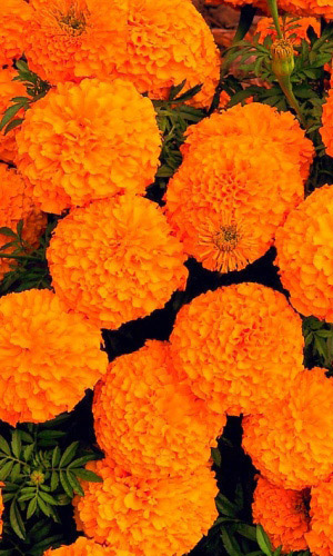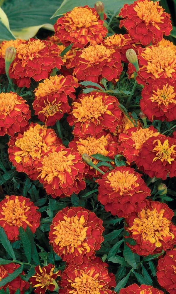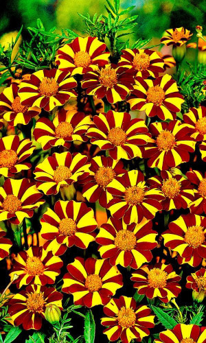 Бархатные соцветия изумительной красоты. Куст компактный, густо-облиственный, в период цветения весь покрывается яркими, двуцветными, оранжево-красными, с золотистыми краями цветками, собранными в махровые соцветия. Используют для клумб, рабаток, бордюров и украшения...