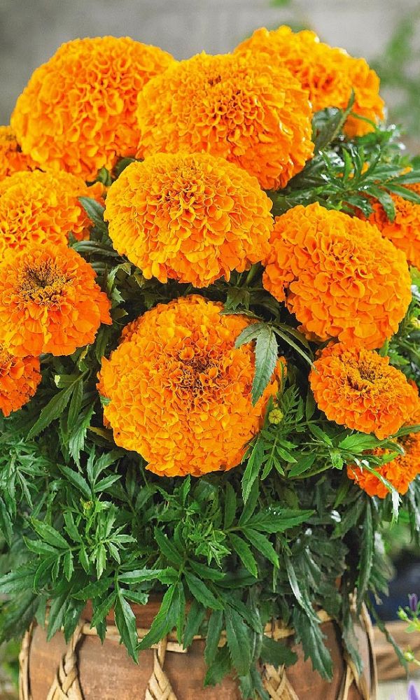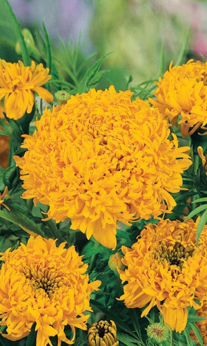 Обильное и продолжительное цветение. Растение высотой до 90 см. Цветки собраны в крупные, махровые и шарообразные соцветия - корзинки, диаметром до 10 см, жёлтой и оранжевой окраски. Цветет с июня до заморозков. Чтобы продлить цветение, необходимо удалять увядшие цветки...