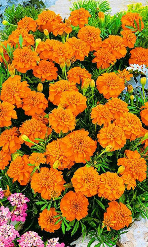 Низкорослые, компактные, обильно цветущие бархатцы, с крупными, махровыми соцветиями сочного, ярко-оранжевого оттенка, великолепно украсят любую цветочную композицию. Кустики выровненные, не вытягиваются, остаются плотными и компактными на весь период цветения...