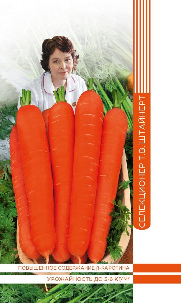 Ровные, однородные корнеплоды с насыщенной окраской. Популярный раннеспелый сорт. Сортотип Амстердам. Период от всходов до уборки урожая 70-90 дней. Корнеплоды среднего размера, цилиндрические с тупым кончиком, с превосходной внутренней и внешней окраской. Масса 80-150 г. Поверхность гладкая с мелкими глазками, оранжевая. Мякоть сочная, с очень высоким содержанием каротина, отличного вкуса. Рекомендуется для использования в свежем виде и зимнего хранения...