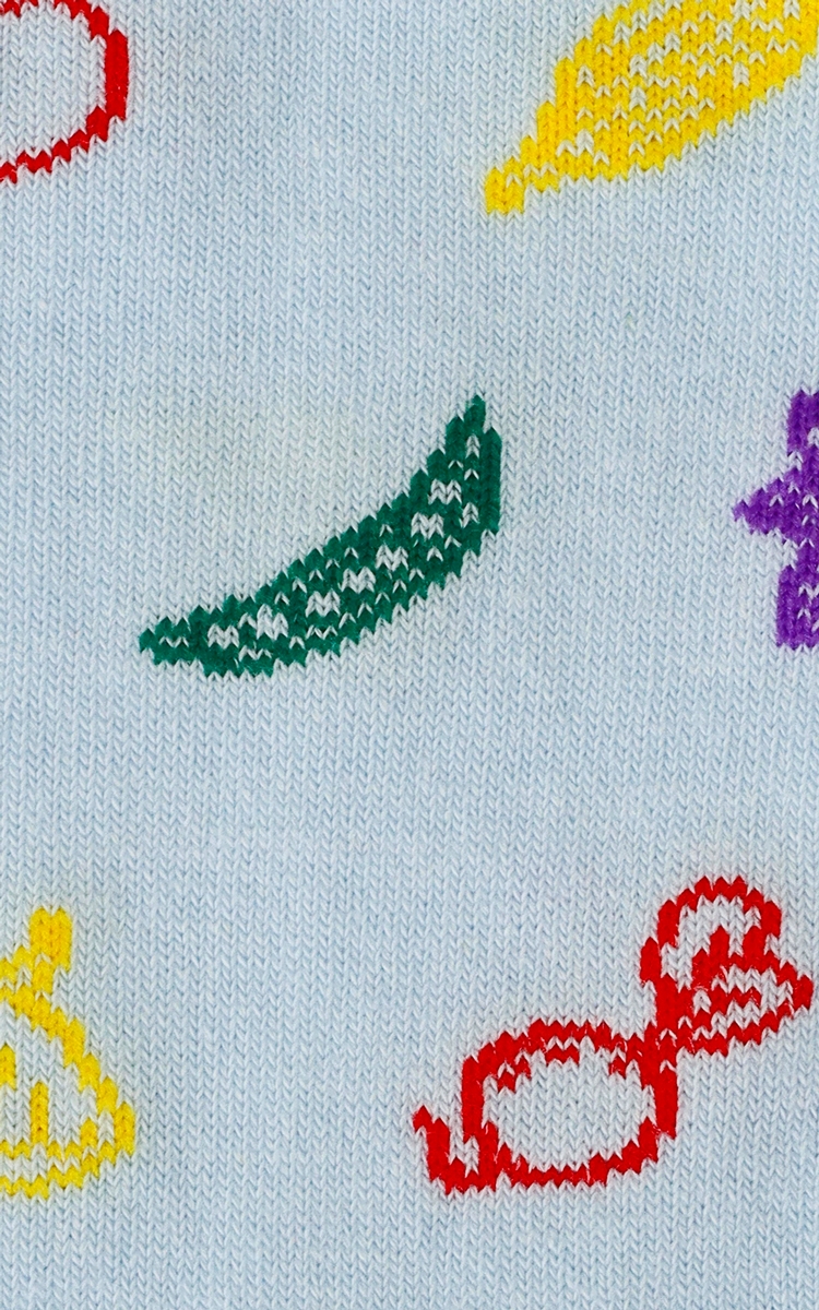 Небесно-голубые носки с жёлтым носком и нашим собственным паттерном культур, входящих в рецепт овощного рагу.