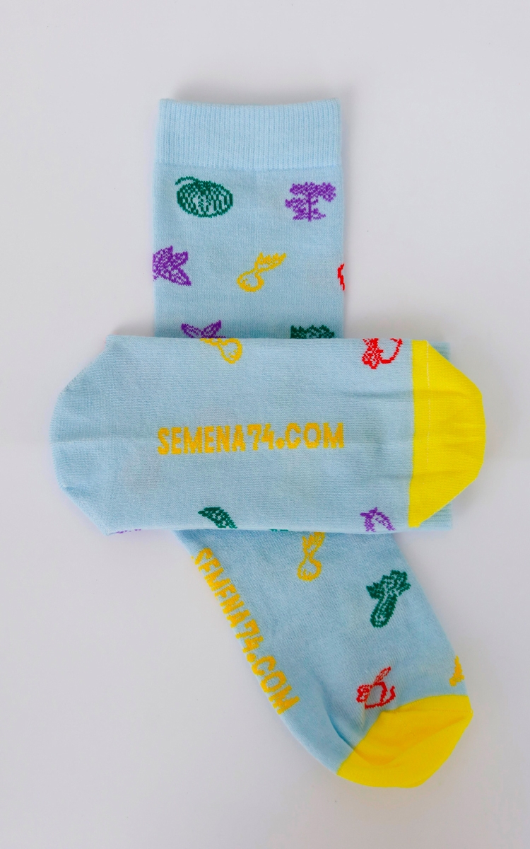 Небесно-голубые носки с жёлтым носком и нашим собственным паттерном культур, входящих в рецепт овощного рагу.