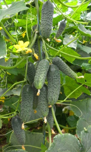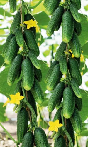 Раннеспелый партенокарпический гибрид, для открытого грунта и плёночных теплиц. В плодоношение вступает через 42-44 дня. Растение с букетным типом завязи, формирует несколько зеленцов в одном узле. Плоды цилиндрические, крупнобугорчатые, слегка ребристые, тёмно-зелёные...