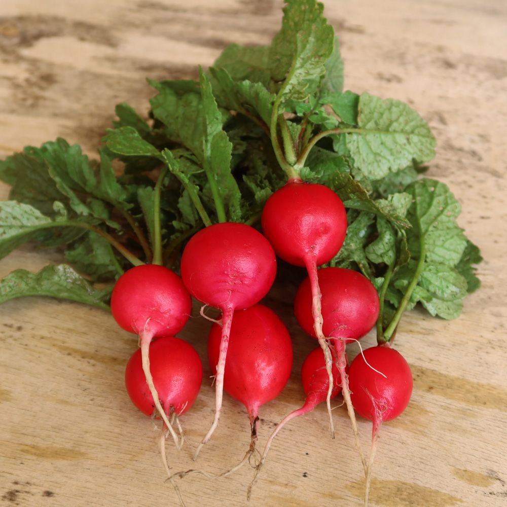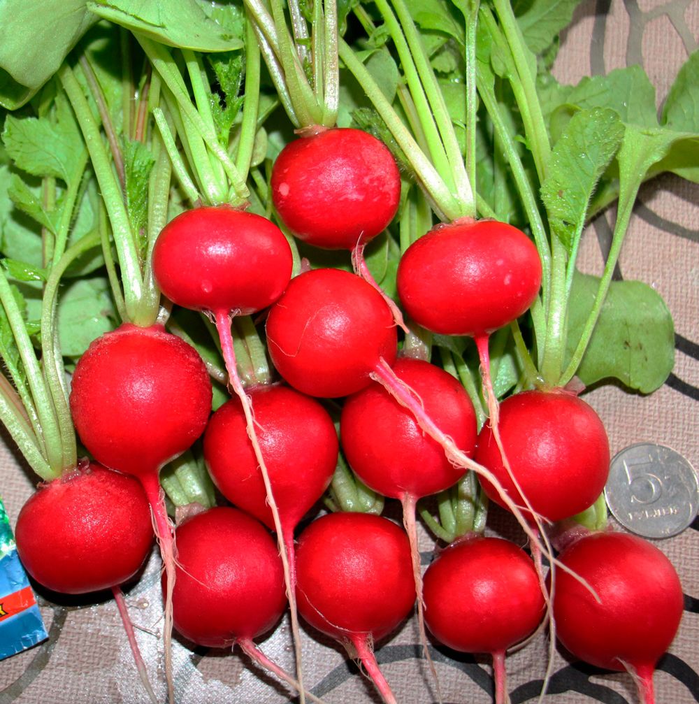 Новый ультраскороспелый, всесезонный гибрид (срок созревания 16-18 дней после посева), устойчивый к стрелкованию. Корнеплоды тёмно-красные, очень крупные, плотные, округлые, массой 25-35 г. Мякоть нежная, белая, сочная, без горечи, вкусовые качества отличные.
