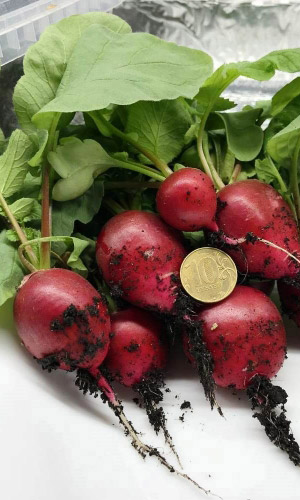 Очень аппетитный, сочный и хрустящий деликатес. Корнеплоды выравненные, рубиново-красные, диаметром 2,5-5 см, подходят быстро, не пройдёт и трёх недель после появления всходов, как они уже просятся на стол.