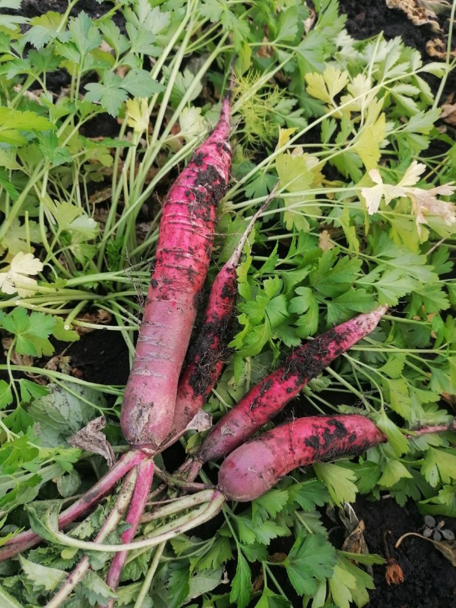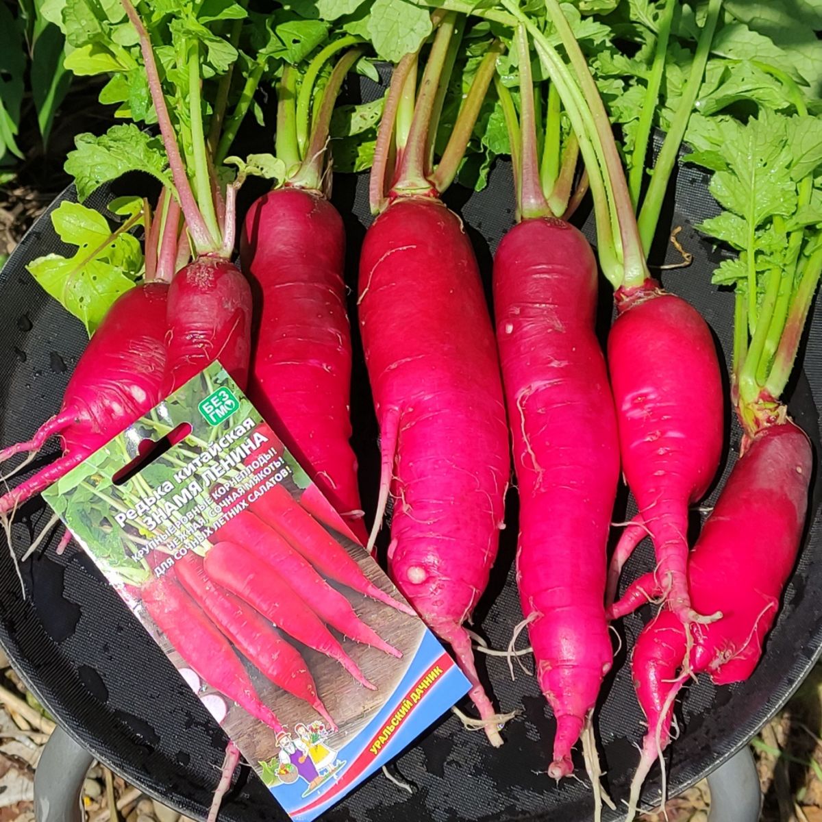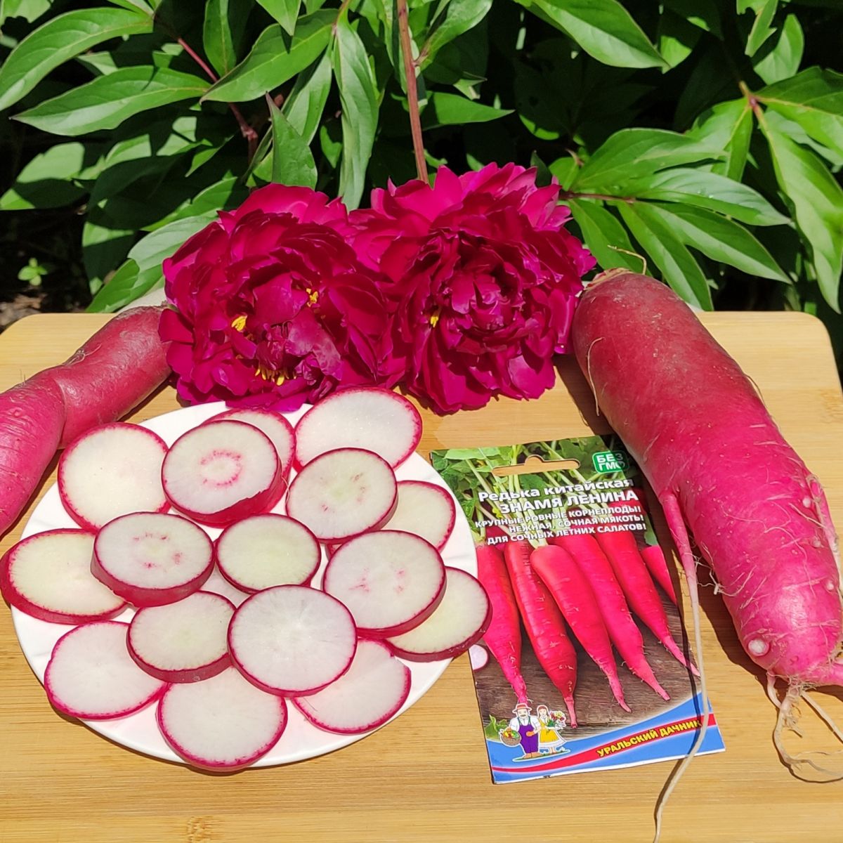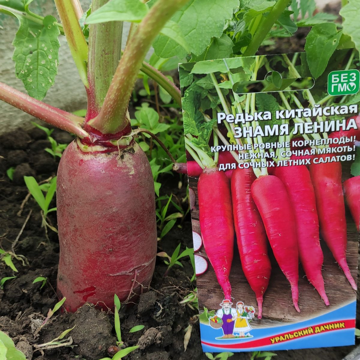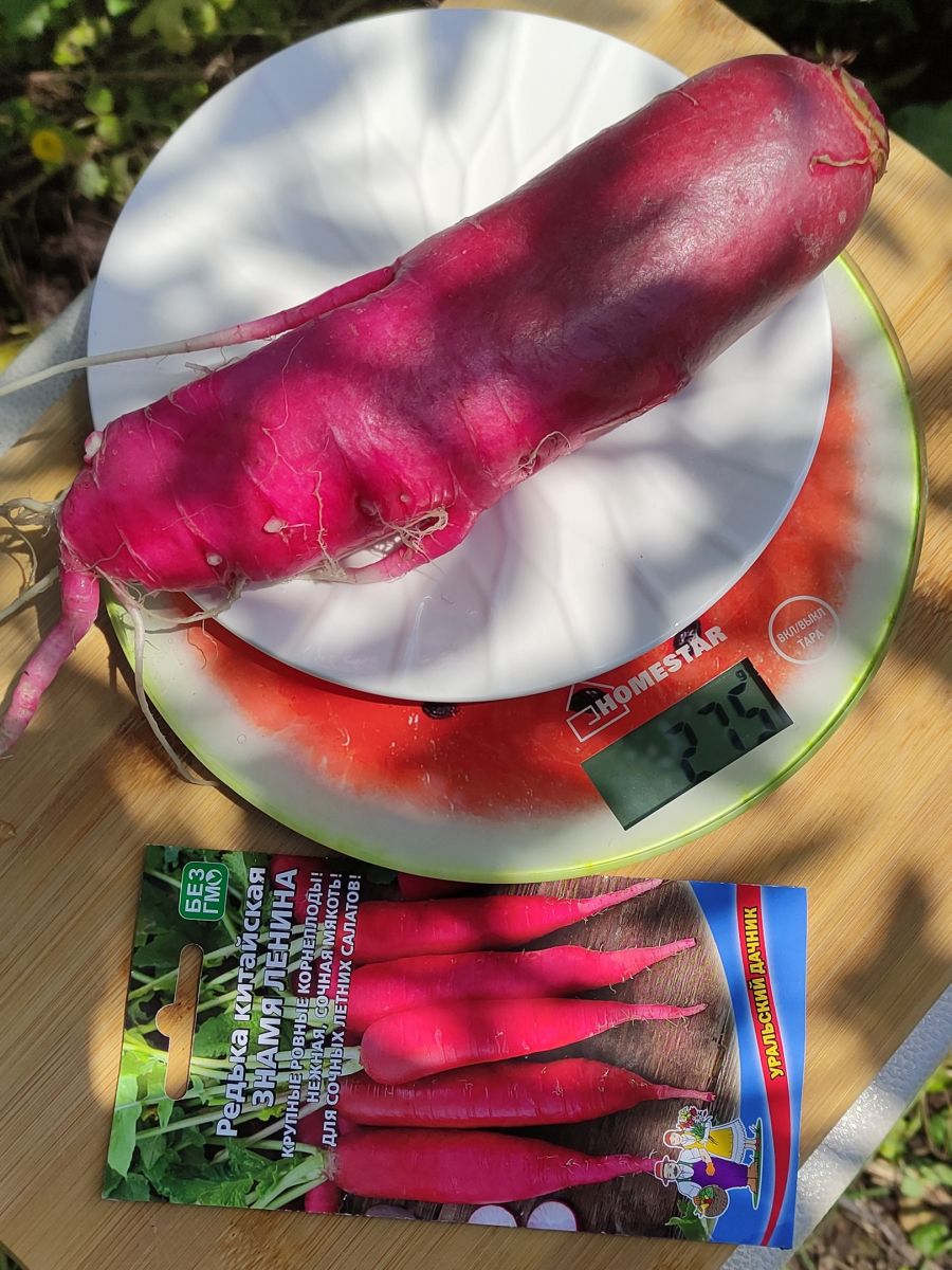 И под № 1 в ресторанном меню, конечно же, салат. Как вам название Знамя Ленина? Готовим его из одноименной китайской редьки (лобы), которая поспевает после формирования полных всходов за 50-55 дней (раннеспелая). Почему Знамя Ленина? Всё дело в цвете корнеплода, который действительно эксклюзивный – редька с белоснежной, нежнейшей, наполненной соком, мякотью обрамлена практически в красную, очень яркого, насыщенного цвета «шубку». Интересен и цвет, и форма – корнеплод цилиндрический, массой 150-300 г, с прямостоячей розеткой листьев. Представляете эту красоту?