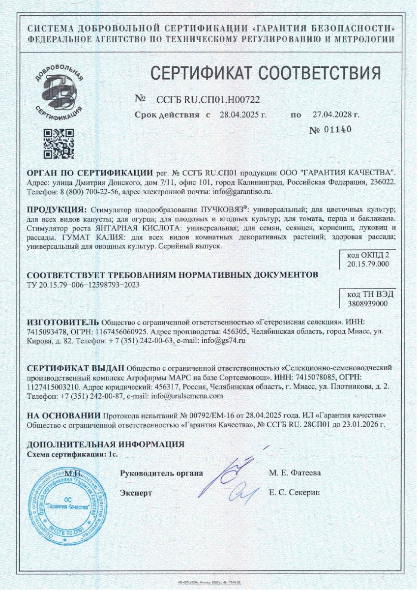 Фасовка 0.1 гСпособствует увеличению числа завязей овощных и плодово-ягодных культур и предохраняет их от опадания, увеличивает урожайность на 20-35 %, ускоряет созревание, повышает энергию прорастания семян овощных, злаковых и декоративных растений, обеспечивает получение более ранних и дружных всходов, повышает сопротивляемость растений к болезням и стрессовым условиям выращивания...