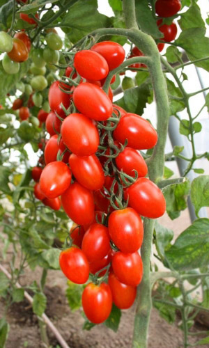 Необычайно урожайный, среднеспелый сорт для открытого и закрытого грунта. Растение штамбовое, высотой 100-130 см. Плоды ярко-красные, глянцевые, сливовидной формы, массой 80-120 г, плотные, без сочленения в плодоножке, долго хранятся на растениях и после уборки.Ценность сорта: очень высокая урожайность, жаростойкость, устойчивость к растрескиванию плодов и комплексу заболеваний. Рекомендуется для потребления в свежем виде, кулинарной переработки и цельноплодного консервирования...