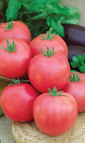 Розовая окраска плода сочетается с отличными вкусовыми качествами. Для открытого грунта. Среднеспелый сорт. Период от всходов до начала созревания 110-125 дней. Растение высотой 60-70 см. Плоды удлинённо-овальные, массой 80-115 г. В кисти 5-6 плодов. Сорт устойчив к комплексу болезней. Универсальное использование...