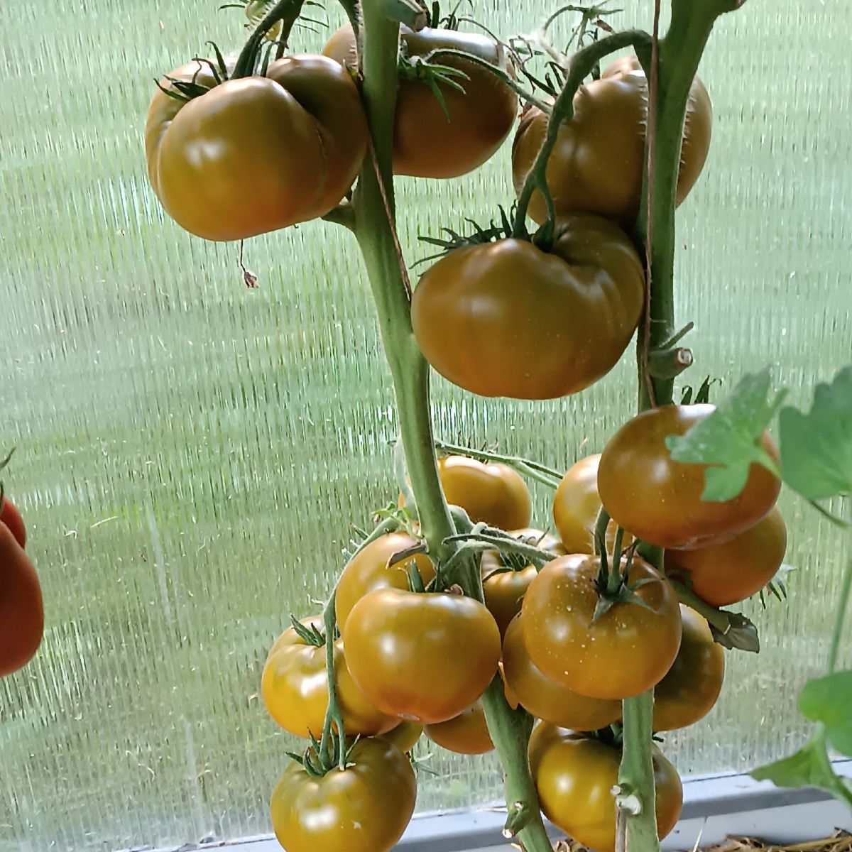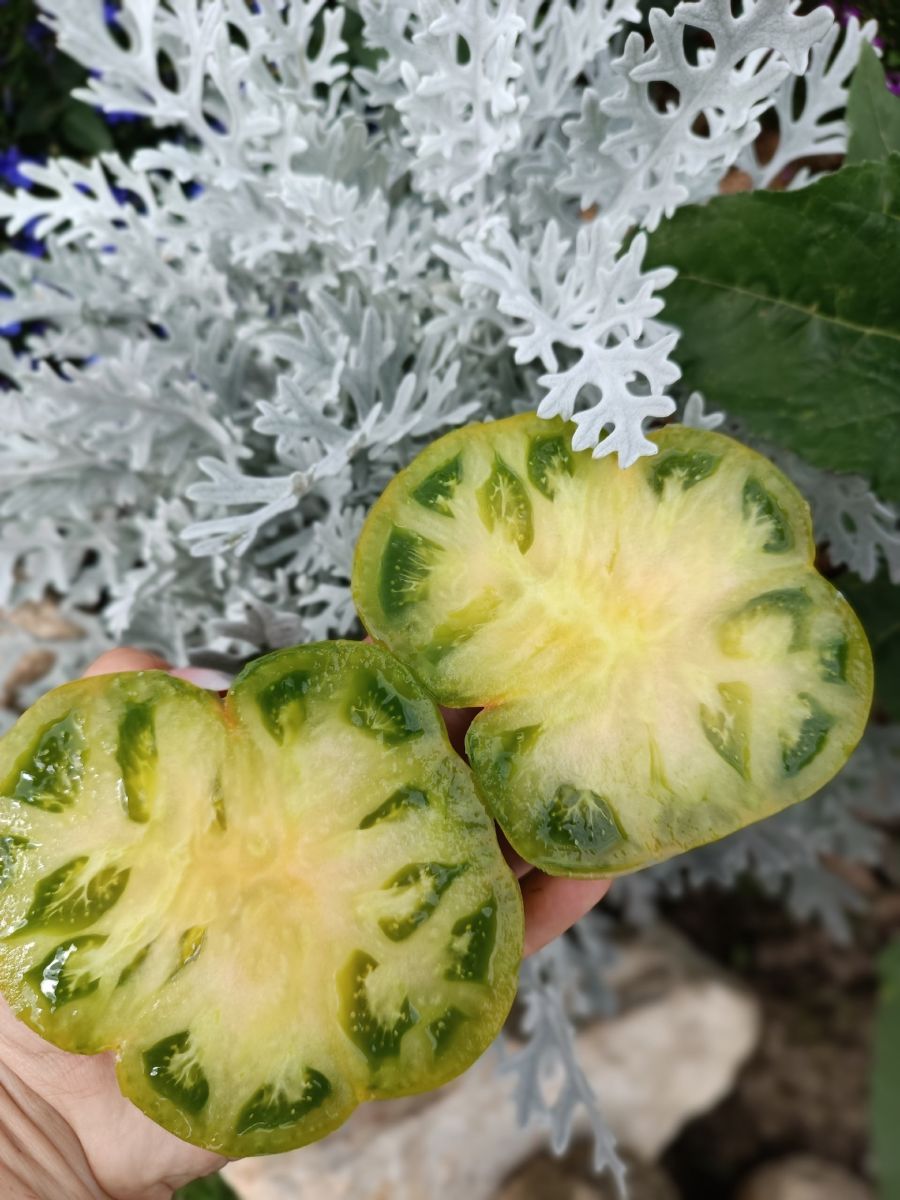 Закрытый грунтНовый оригинальный гибрид томата, отличающийся от собратьев необычайно сладким вкусом! Среднеранний (110-112 дней от всходов до урожая) для выращивания в теплицах. Растение мощное, крепкое, высотой 120-150 см. Первое соцветие – над 8-9-м листом, в кисти 3-5 плодов. Плоды крупные, отдельные до 400 г, выровненные, округло-плоские, многокамерные, мясистые, сочные, сахарные. Окраска плодов неярко-зелёная, переходящая по мере созревания в жёлто-зелёную с еле заметными полосками.