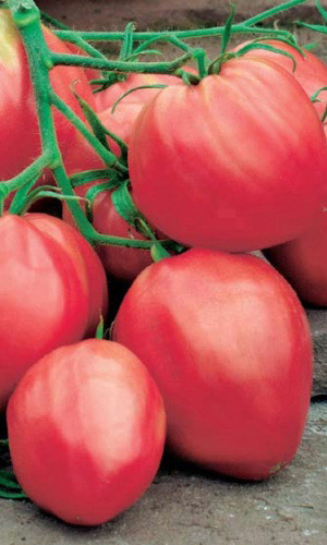 Среднеспелый крупноплодный сорт для плёночных теплиц и открытого грунта. Куст мощный, высотой 100-170 см. Плоды малиново-красные, мясистые, красивой сердцевидной формы, очень крупные, массой 400-700 г, отдельные до 1,2 кг, великолепны в салатах и заготовках на зиму. К достоинствам сорта, кроме того, относятся хорошая завязываемость плодов и достаточно высокая устойчивость к болезням. Сорт выращивают в 2 стебля...
