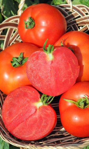 Суперурожайный среднеспелый сорт. Растение высокорослое (160-190 см). Плоды сердцевидной формы, мясистые, очень сладкие и вкусные, массой до 900 г. Отличается высокой устойчивостью к болезням: альтернариозу, фузариозу, вирусу табачной мозаики. Рекомендуется для использования в свежем виде и приготовления томато-продуктов. Идеален для приготовления томатов в собственном соку...